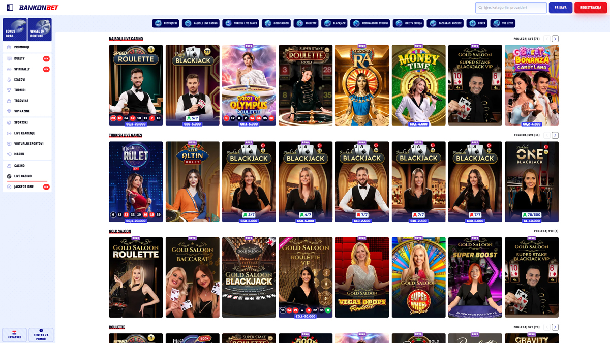 Kasino uživo Kasino uživo Casino igre u stvarnom vremenu prenošene streamingom iz profesionalnih studija ili fizičkih casina s pravim krupijeima i interaktivnim stolnim igrama.
