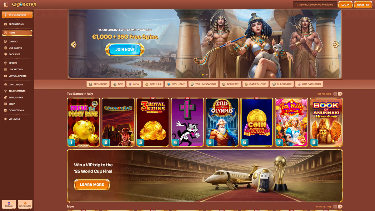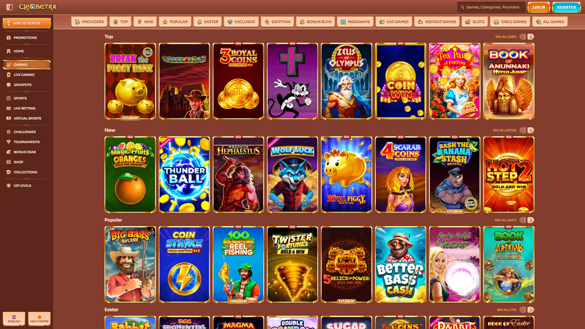 Cleobetra Casino donosi spoj luksuza, uzbuđenja i širokog spektra igara na jednom mjestu. Pod okriljem Casinove grupe, nudi cjelovitu casino sekciju, okruženje s pravim dilerima i integriranu sportsku kladionicu. Platforma je dizajnirana za glatku navigaciju i brze performanse, pružajući pouzdano iskustvo igračima iz Hrvatske.