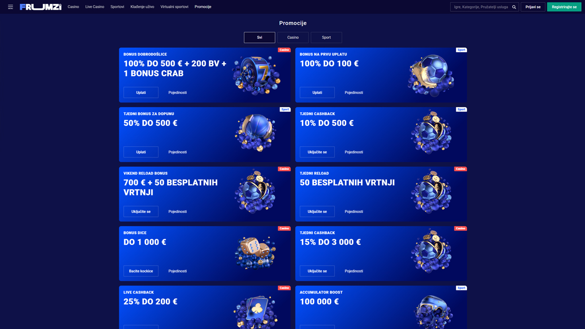 Frumzi Casino je moderno online casino i sportska kladionica koja kombinira šareni, moderan dizajn s ogromnim izborom igara i fleksibilnim mogućnostima igranja. Platforma, lansirana 2020. godine, nudi više od 12.000 slotova, 350+ igara s pravim dilerima i integriranu sportsku kladionicu, sve dostupno putem jednog računa. S igranjem optimiziranim za mobilne uređaje, niskim minimalnim depozitima i podrškom za Pay & Play, Frumzi je dizajniran kako bi pružio besprijekorno i privlačno iskustvo za igrače koji cijene raznolikost, praktičnost i dosljednu igrivost.