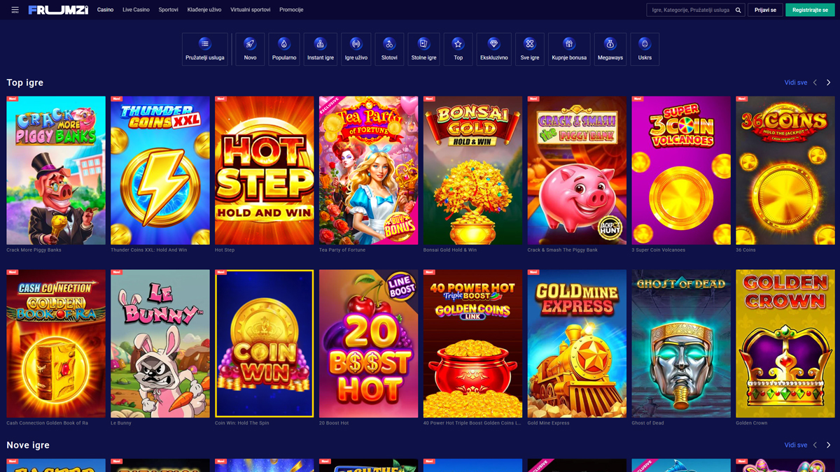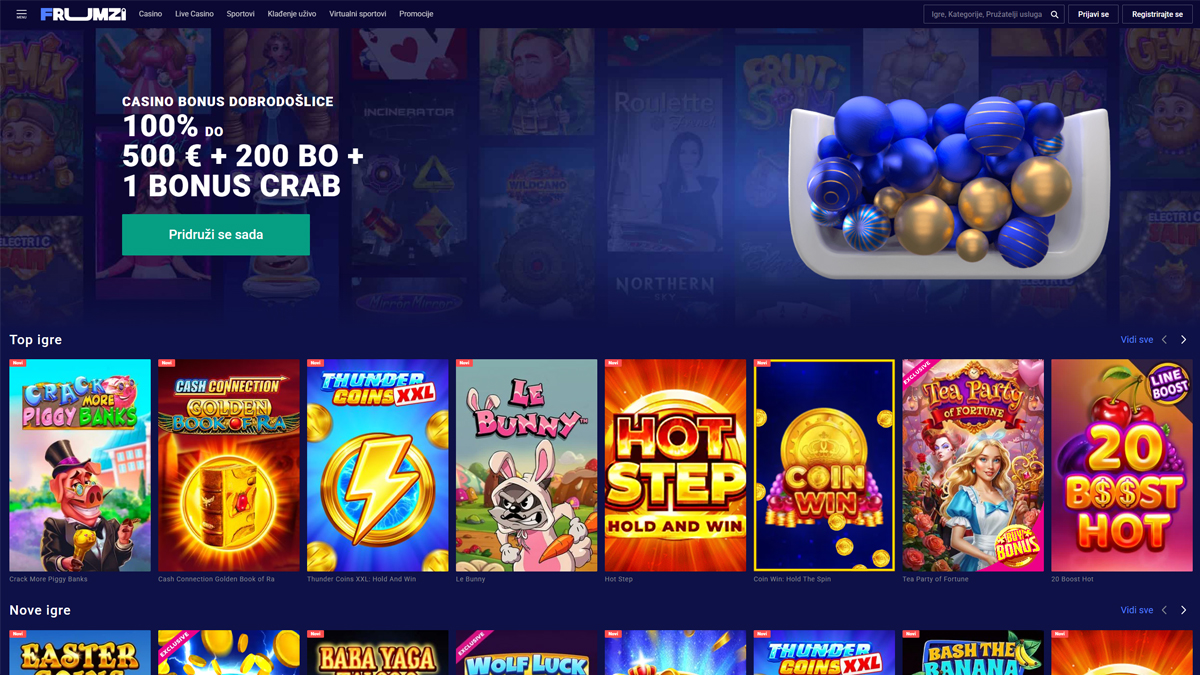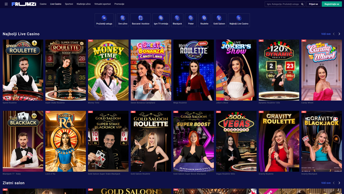 Kasino uživo Kasino uživo Casino igre u stvarnom vremenu prenošene streamingom iz profesionalnih studija ili fizičkih casina s pravim krupijeima i interaktivnim stolnim igrama.