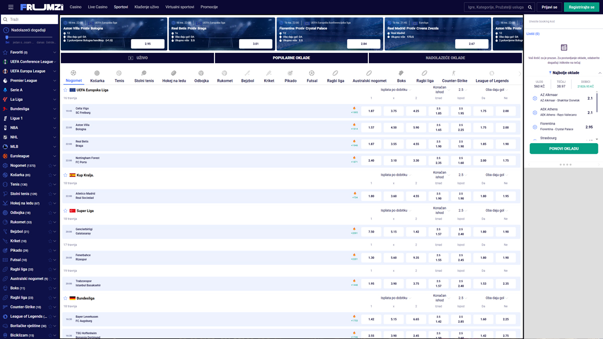 - Integrirana sportska kladionica za oklade prije utakmice i uživo.