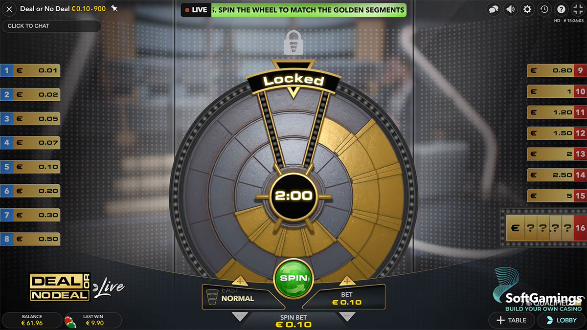 Kada glavna runda započne, sudionici biraju kovčege jedan po jedan. Nakon svakog odabira, otkrivena nagrada se uklanja iz pul-a, a bankar daje ponudu na temelju preostalih vrijednosti. To stvara ključni trenutak odluke: prihvatiti ponudu (“Deal”) ili nastaviti otvarati kovčege (“No Deal”). Ovaj ciklus se ponavlja i gradi napetost dok igrači vagaju potencijalne dobitke naspram rizika. Posebnost ove live verzije su top-up multiplikatori koji se mogu aktivirati u određenim segmentima i povećati vrijednosti odabranih kovčega, čime se dodatno pojačava uzbuđenje. Svi rezultati vidljivi su svim igračima putem live videostreama, što iskustvo čini transparentnim i još privlačnijim.