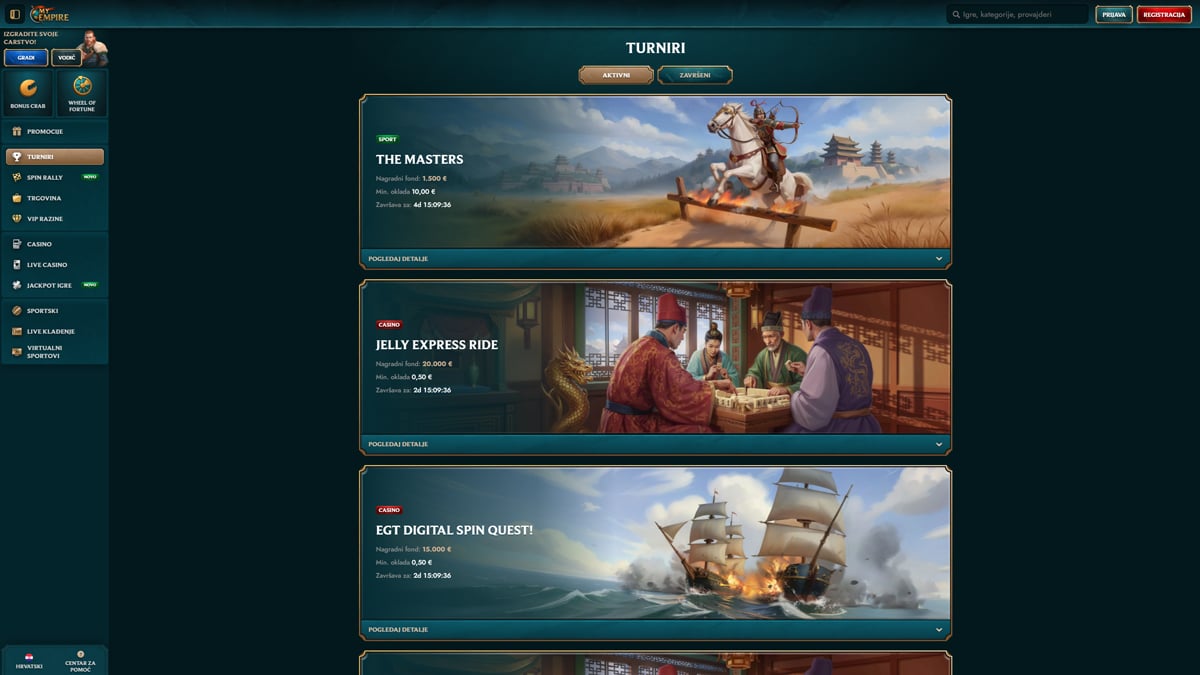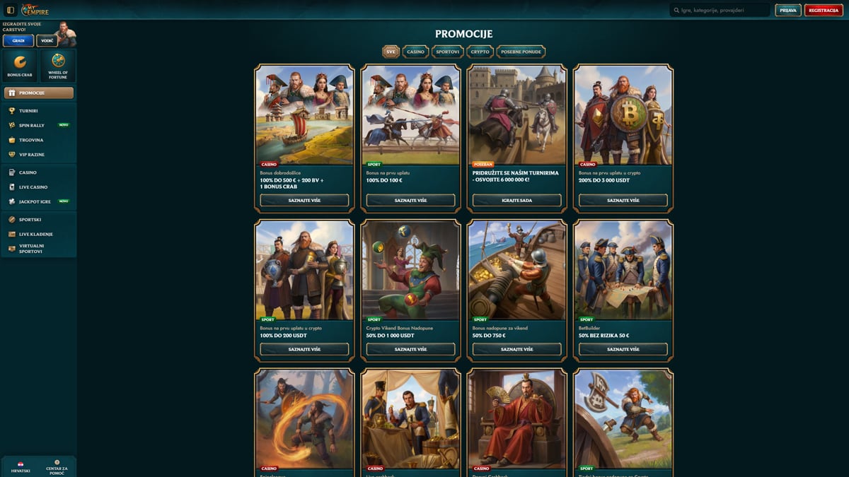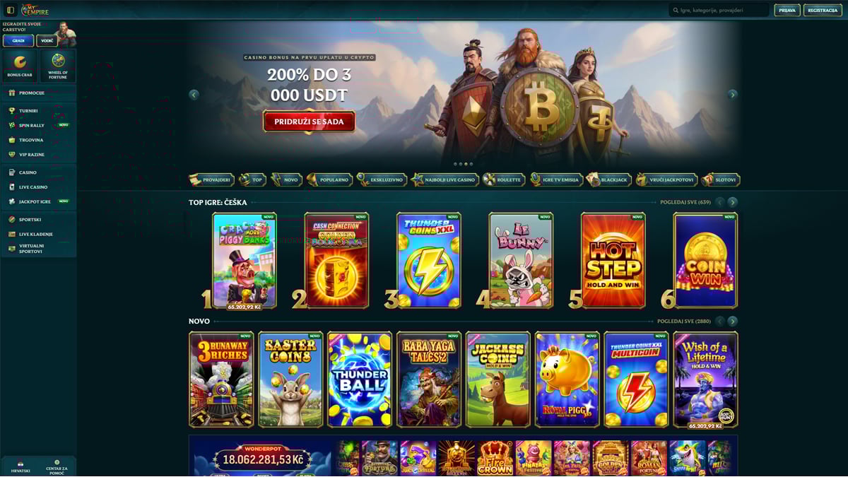 MyEmpire Casino je moderan i brzo rastući online casino i platforma za oklade koja je lansirana 2023. godine i u vlasništvu je te pod upravom Rabidi N.V., nositelja licence Antillephone N.V. (Anjouan, licenca 8048/JAZ), koja regulira međunarodne aktivnosti i osigurava regulirano igranje te sigurnost putem SSL enkripcije. MyEmpire, dizajniran s impresivnom rimskom carskom tematikom, nudi ogromnu biblioteku igara koju industrijski izvori procjenjuju na tisuće naslova – od 900+ do više od 12.000 igara, uključujući online slotove, progresivne jackpotove, klasične stolne igre, instant igre i opsežnu sekciju live casina s live ruletom, blackjackom, baccaratom, pokerom i gameshowovima vodećih pružatelja. Platforma također integrira sekciju sportskih oklada gdje je dostupna. Hrvatski igrači mogu započeti igrati s minimalnim pologom koji obično kreće od 10–20 EUR, ovisno o metodi plaćanja, uključujući tradicionalne opcije i kriptovalute, a minimalne isplate su također pristupačne, iako se točne granice razlikuju po metodi; zabilježena su i tjedna ograničenja isplata oko 7.000€. Isplate preko e-novčanika obično se obrađuju brzo (često unutar 24 sata), dok transakcije karticama i bankovnim transferima mogu trajati 3–5 radnih dana i veće isplate mogu zahtijevati standardnu KYC verifikaciju (osobna iskaznica i dokaz adrese) u skladu s pravilima protiv pranja novca. MyEmpire podržava više valuta, uključujući eure i kriptovalute, upravlja VIP/lojalty programom s prednostima poput povećanih limita i cashbacka, a potpuno mobilno optimizirana web stranica omogućuje igračima pristup cijelom rasponu igara i funkcija oklada na računalima i modernim pametnim telefonima bez potrebe za zasebnom aplikacijom.