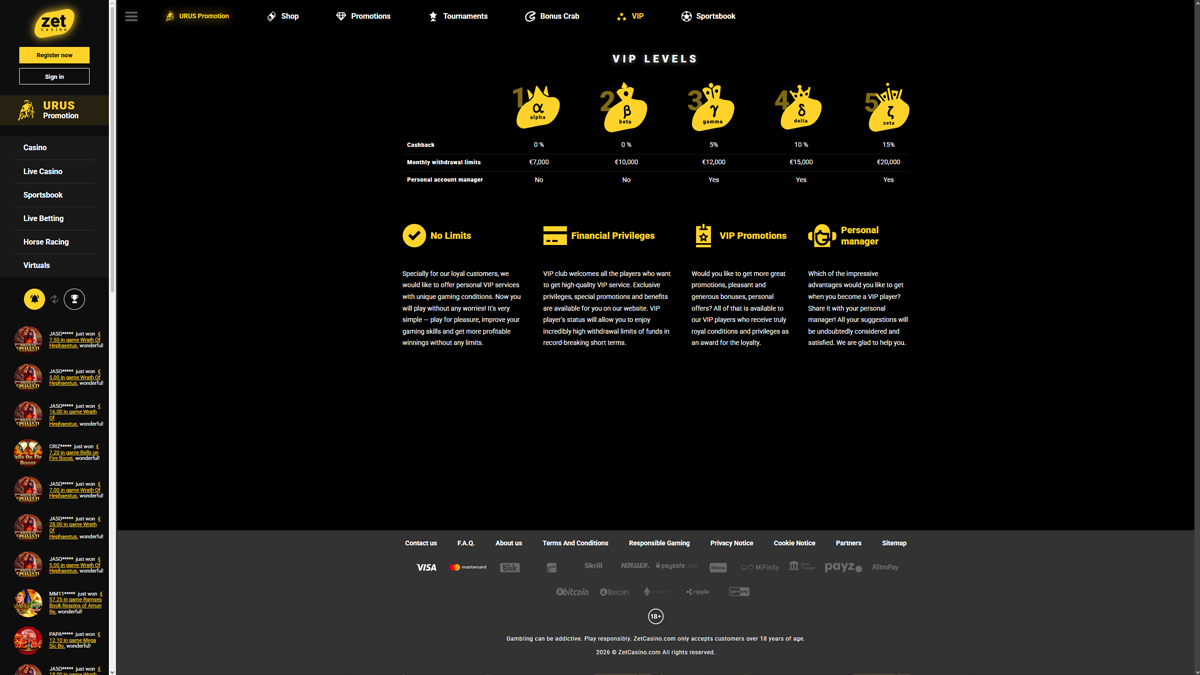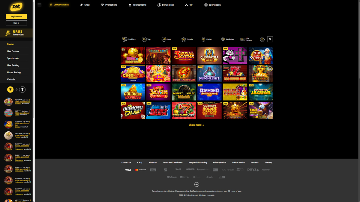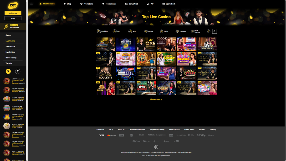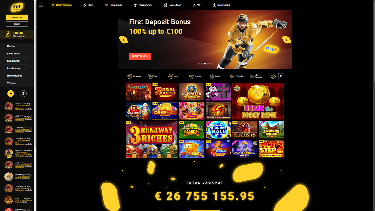 Zet Casino se ističe kao online casino s iznimno bogatom ponudom igara, dizajniran za hrvatske igrače koji cijene veliki izbor, preglednu strukturu i jednostavan pristup putem preglednika. Platforma objedinjuje casino igre i sportske oklade pod jednim računom, a navigacija je uvijek jednostavna i dosljedna u svim dijelovima. S više od 9.400 slotova i preko 260 naslova u live casinu i stolnim igrama, fokus je na kvantiteti i raznovrsnosti umjesto na specijaliziranim dodacima.